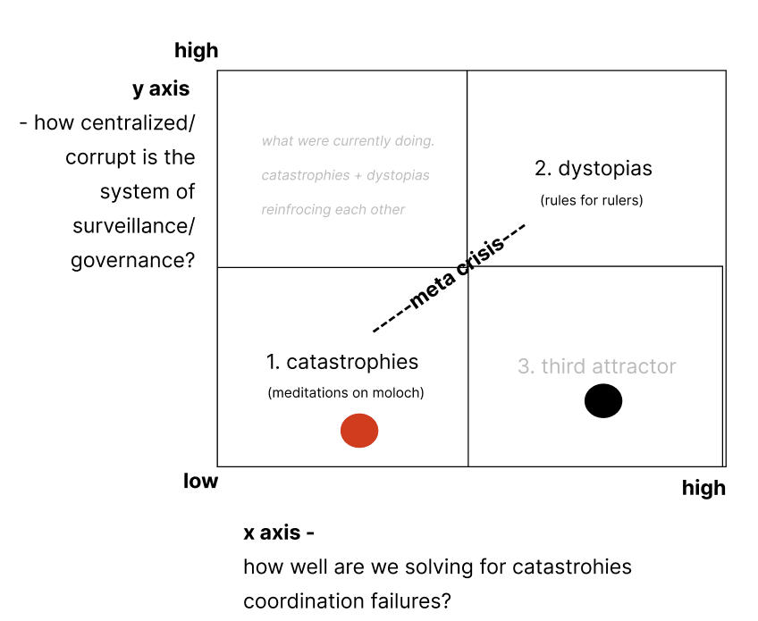 The third attractor envisions a regenerative, decentralized future where humanity leverages intelligence and technology to create thriving systems. This path isn't automatic—it requires intentional design of new institutions and coordination mechanisms that can navigate complexity without resorting to dystopian control structures.